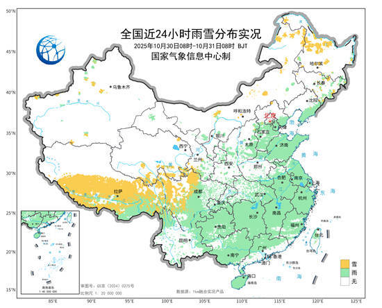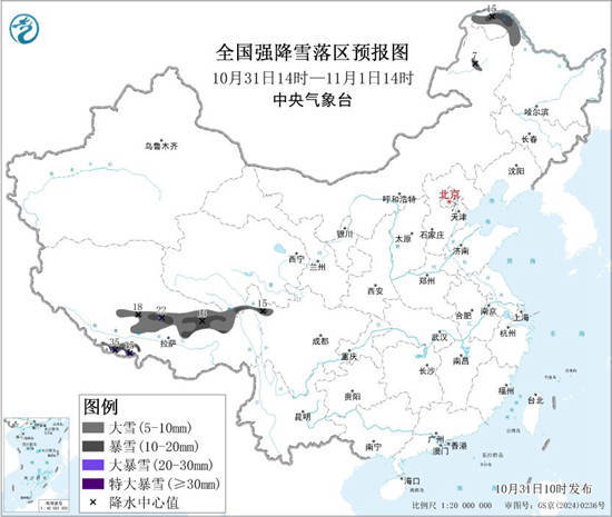 预计未来两天,北印度洋的水汽将继续向我国青藏高原和西南一带输送,西藏等地的雨雪天气将持续到11月3日,同时还会给西南地区甚至给长江沿线带来降雨。根据中央气象台预报,今天下午至明天中午,西藏中东部和南部、青海南部、川西高原北部等地部分地区将有大到暴雪,其中,西藏中部局地有大暴雪,西藏南部局地有大暴雪或特大暴雪。上述部分地区新增积雪深度4至8厘米,山区局地可达15厘米以上。