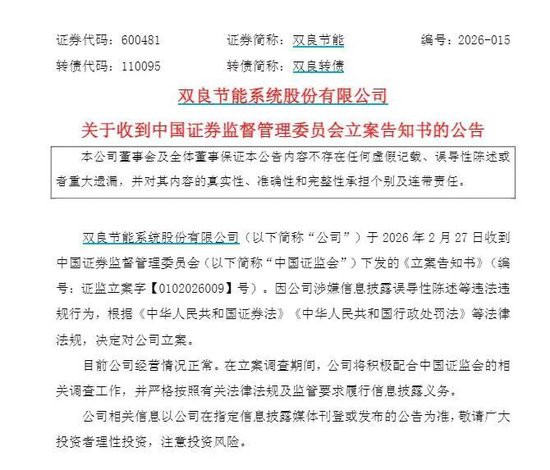 2月27日晚间,双良节能(600481)公告称,公司于27日收到中国证监会下发的《立案告知书》。因公司涉嫌信息披露误导性陈述等违法违规行为,根据《中华人民共和国证券法》《中华人民共和国行政处罚法》等法律法规,中国证监会决定对公司立案。