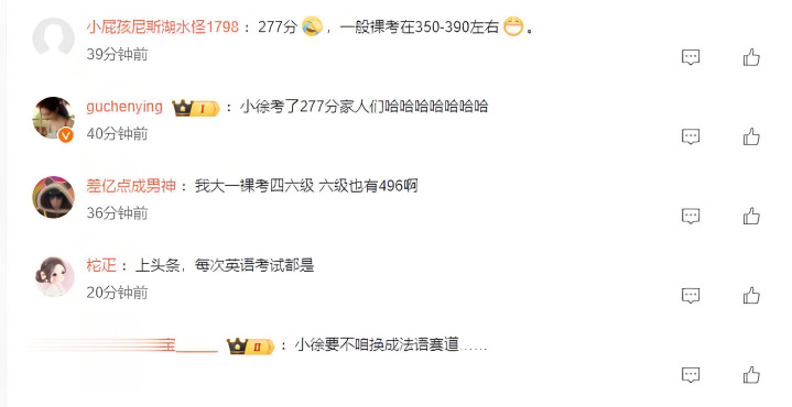 有人玩梗治愈焦虑。“小徐考了277分家人们哈哈哈哈哈哈哈,”这类评论收获大量点赞。更有网友幽默总结:“277分,一般裸考在350-390左右。”